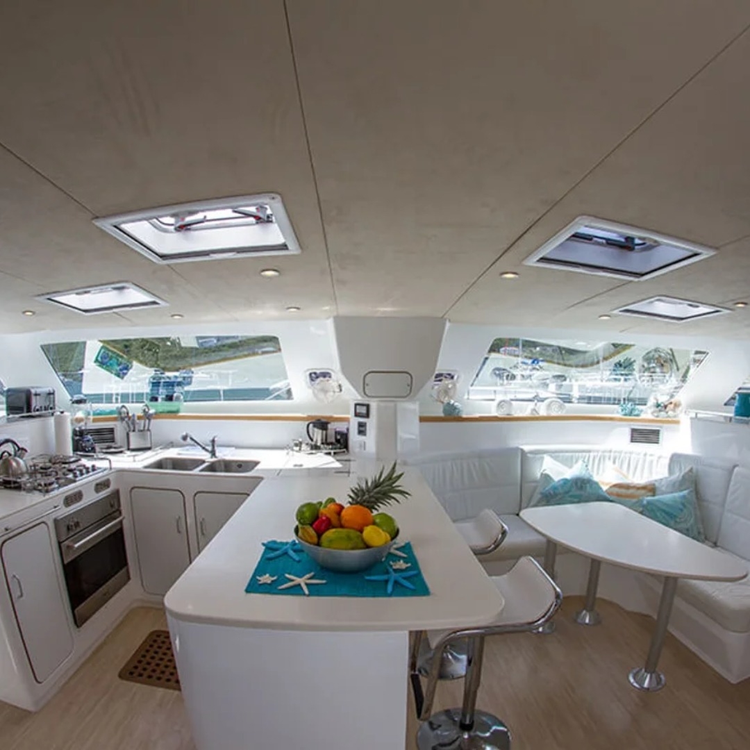 The Voyage 480 typically accommodates up to 10 guests, depending on configuration, with comfortable double cabins offering privacy and storage for longer sailing holidays. Its shallow draft allows easy access to beaches, mooring fields and sheltered bays throughout the British Virgin Islands.