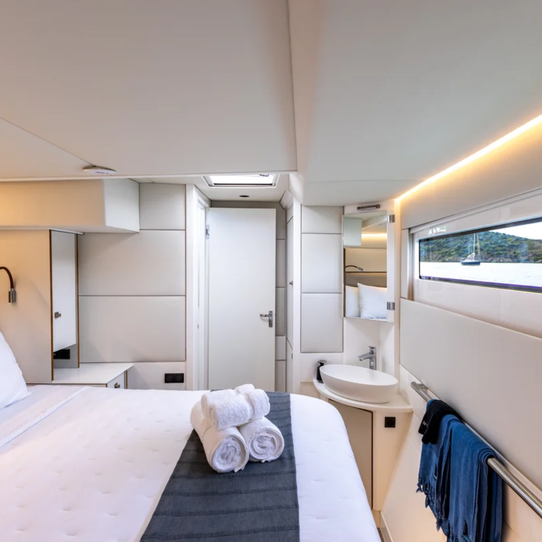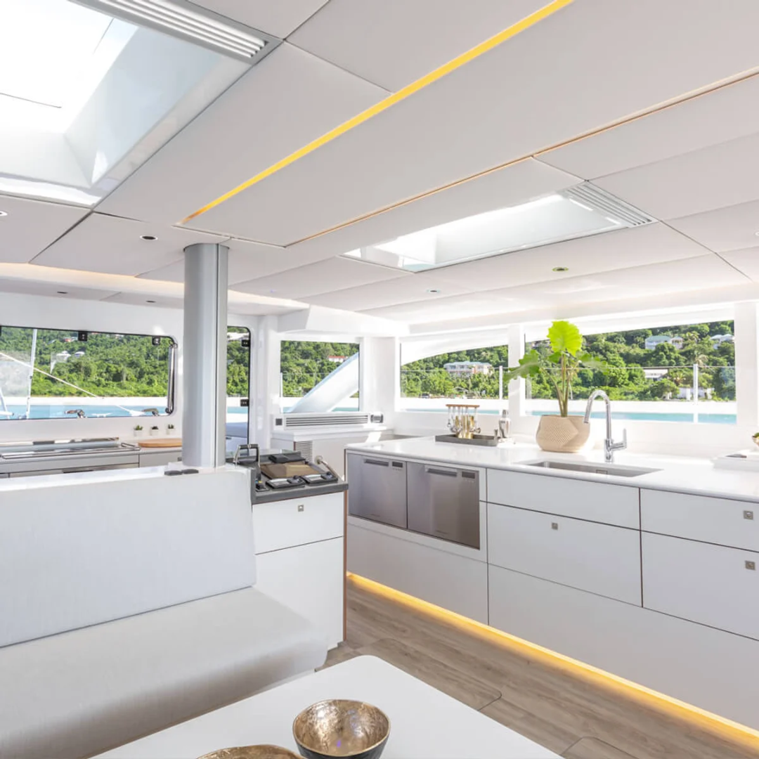 The yacht offers expansive deck areas, a wide cockpit ideal for dining and entertaining, and multiple lounging spaces both forward and aft. Inside, the saloon is bright and refined, with high-quality finishes and a fully equipped galley suitable for extended charters.